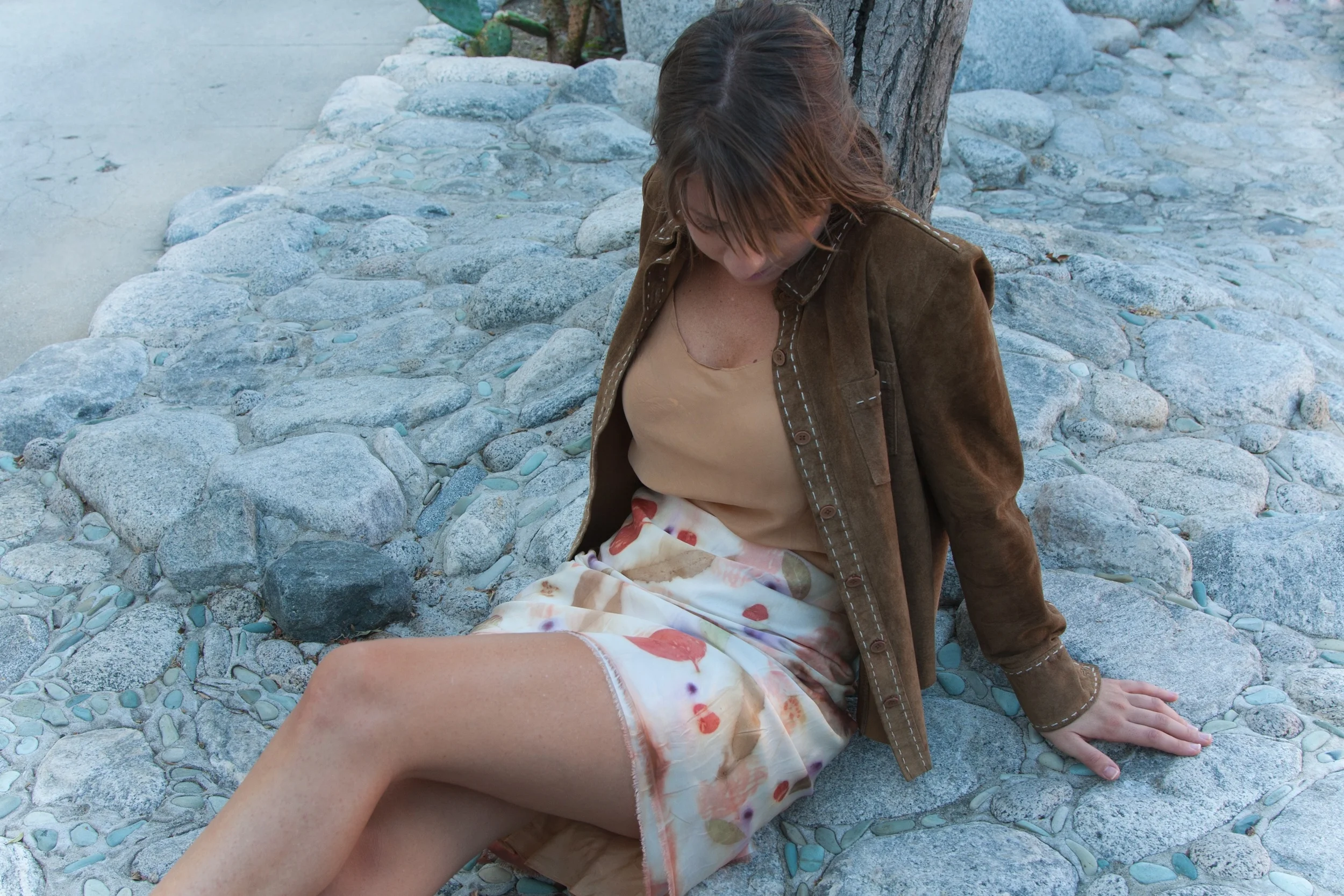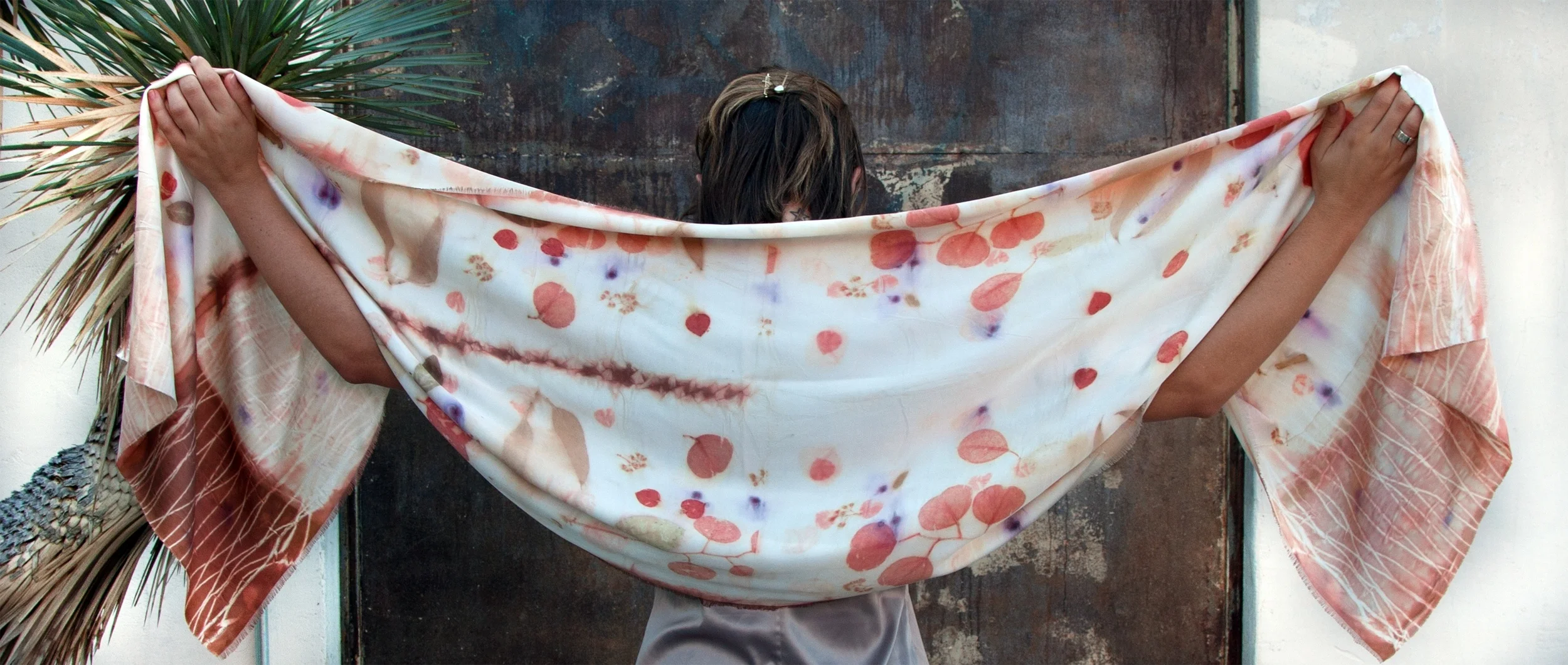 hand dyed and imprinted eucalytpus leaves and seed pods, other leaves, cochineal